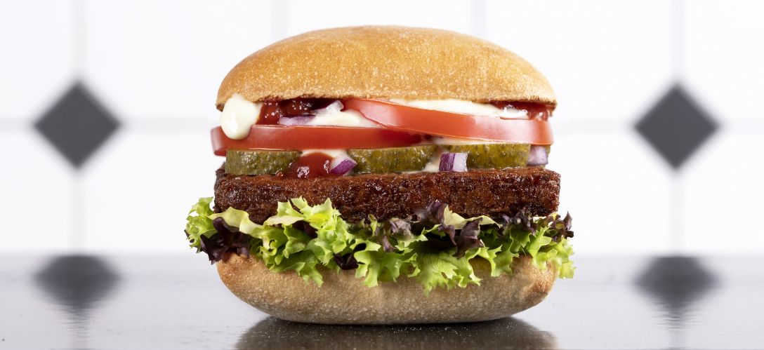 Soja Patty, Salate, Ketchup, Zitronen-Mayo, Rote Zwiebel, Gewürzgurke, Tomate