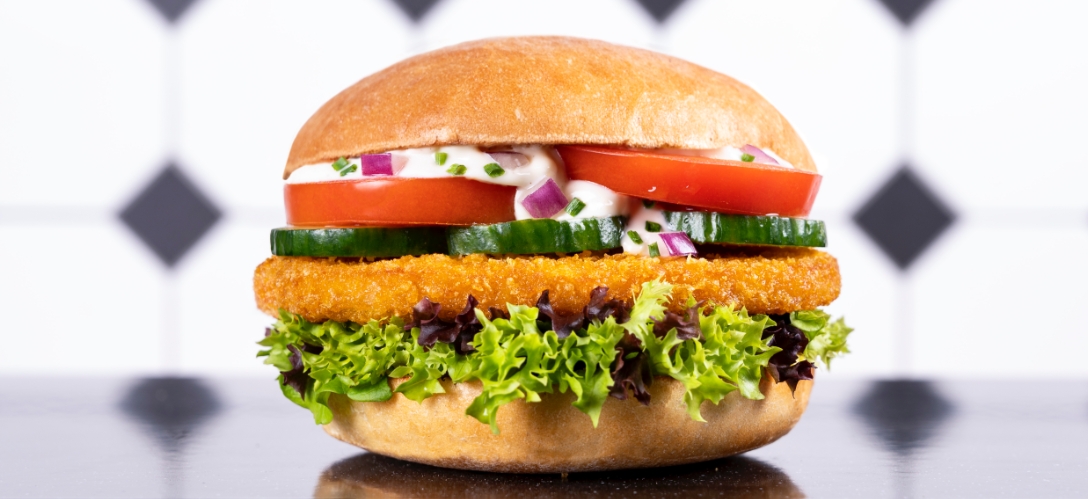 From Vienna with Love! Knuspriges veganes Schnitzel gepaart mit knackigen Salaten, sonnengeküsster Tomate, frischer Gurke und roten Zwiebeln, gebettet auf hausgemachter Knoblauchsauce mit frischem Schnittlauch. Nur du allein, sollst stets der Burger meiner Träume sein.